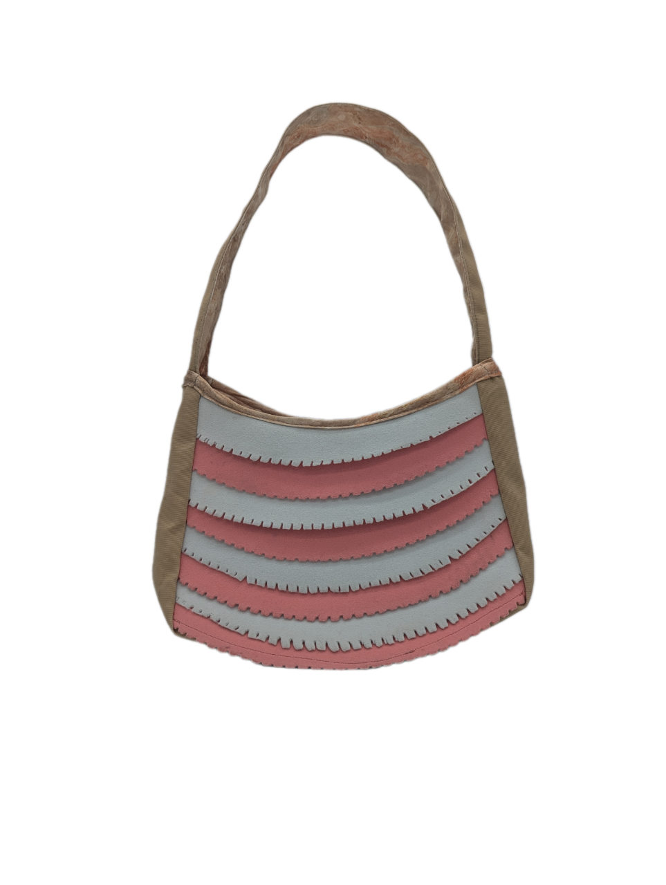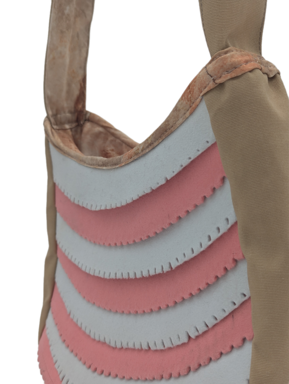 Sac à main réalisé dans des rognures ( chutes des bords) de chapeaux en feutre de laine roses et bleus claires, des chutes de toiles de tipi beiges et doublé en rideaux aux couleurs douces, le tout donne un sac avec de la tenue et solide. Un pur produit upcycling en pièce unique !