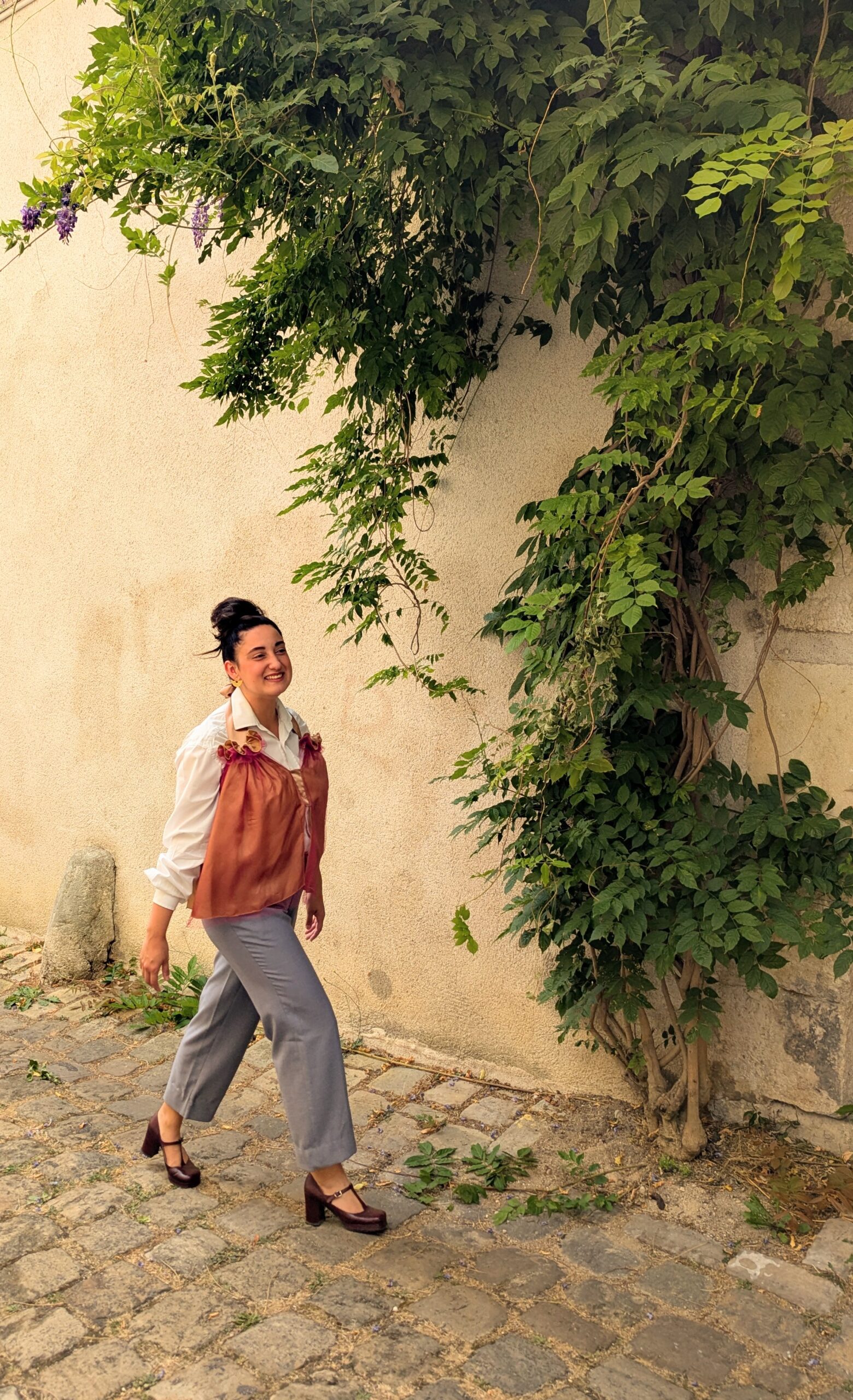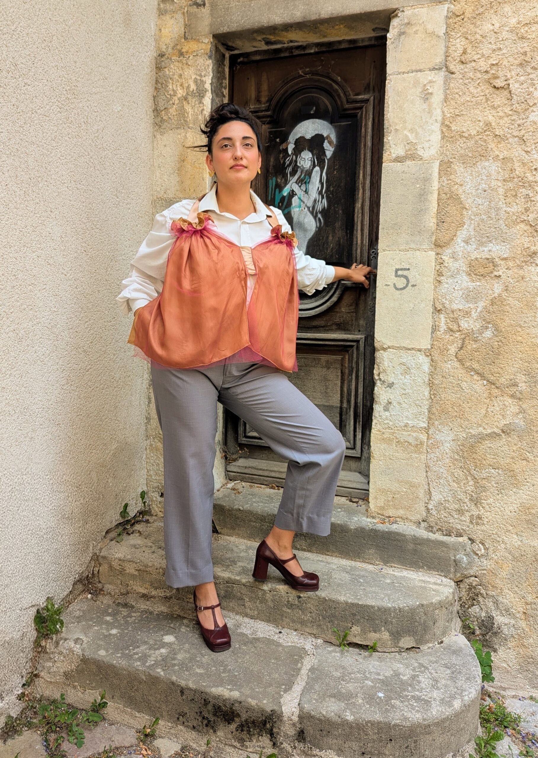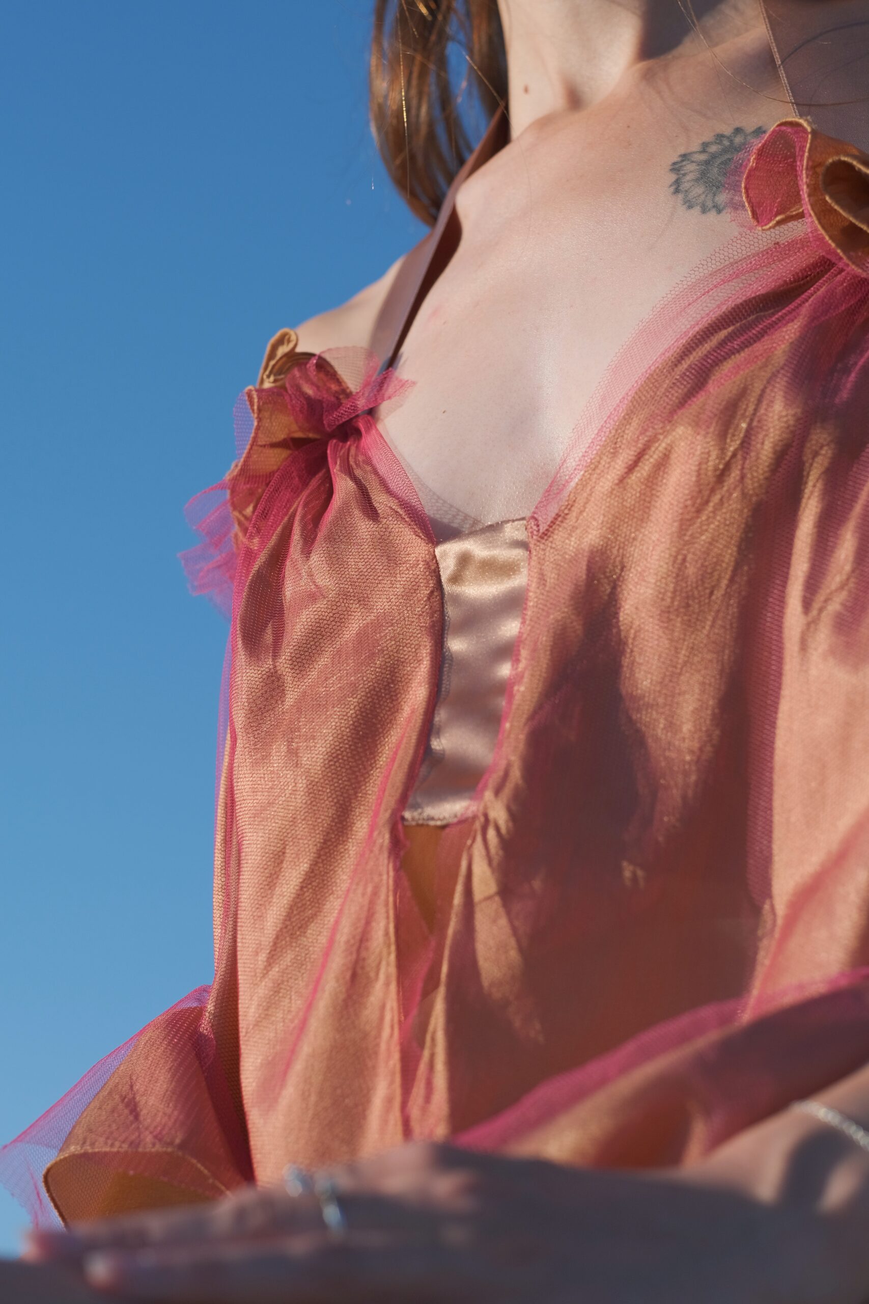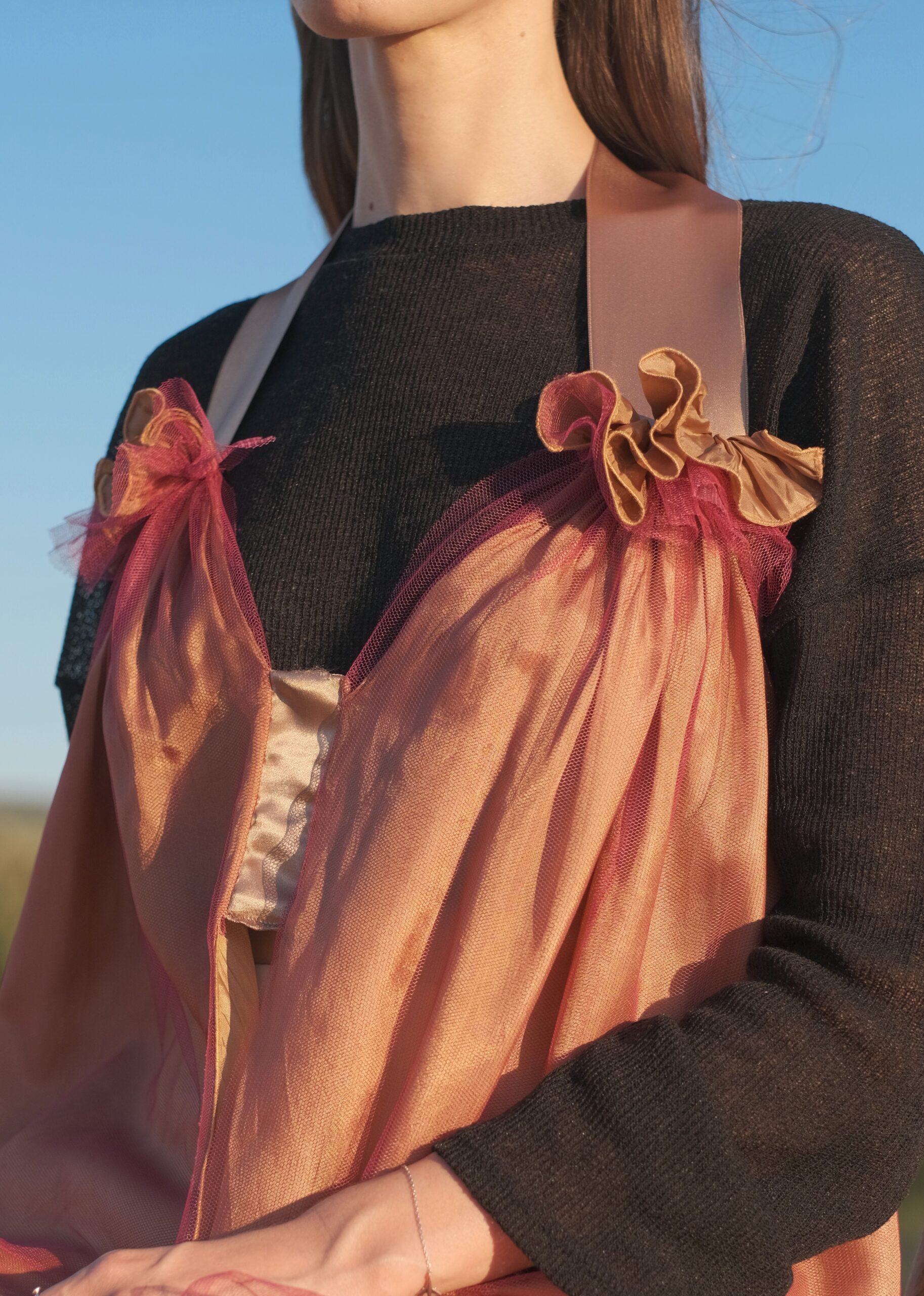 Le top tulle est composé de deux rectangles de tissu, une doublure pongé caramel, joint à du tulle, rose framboise, par des fronces qui créent du volume et de jolis reliefs, le tout maintenu par des rubans de satin caramel.