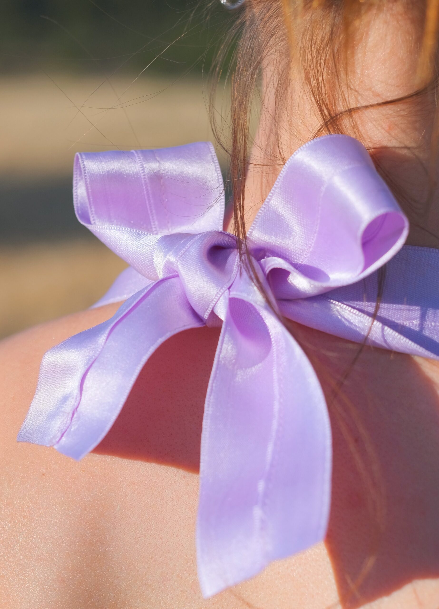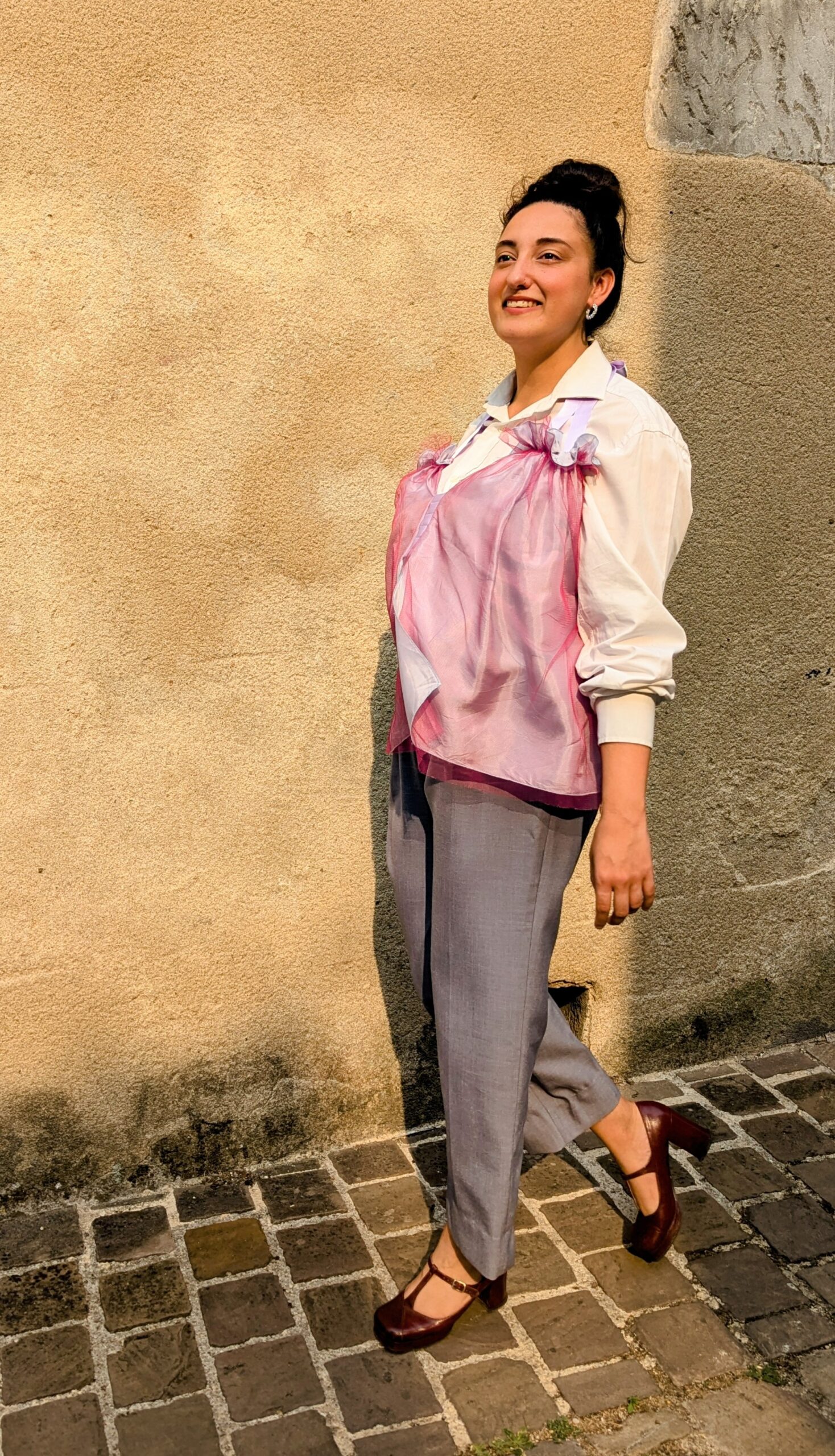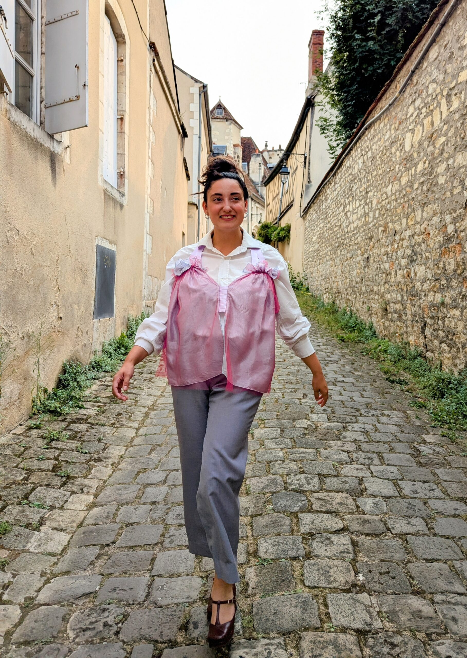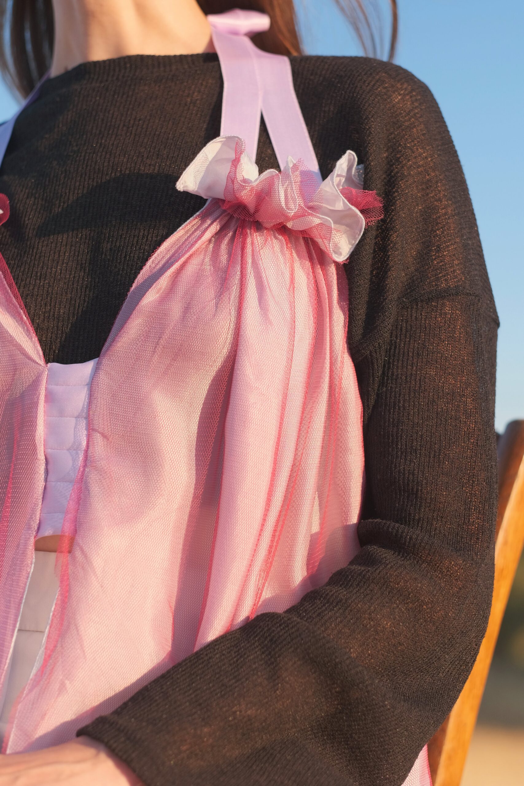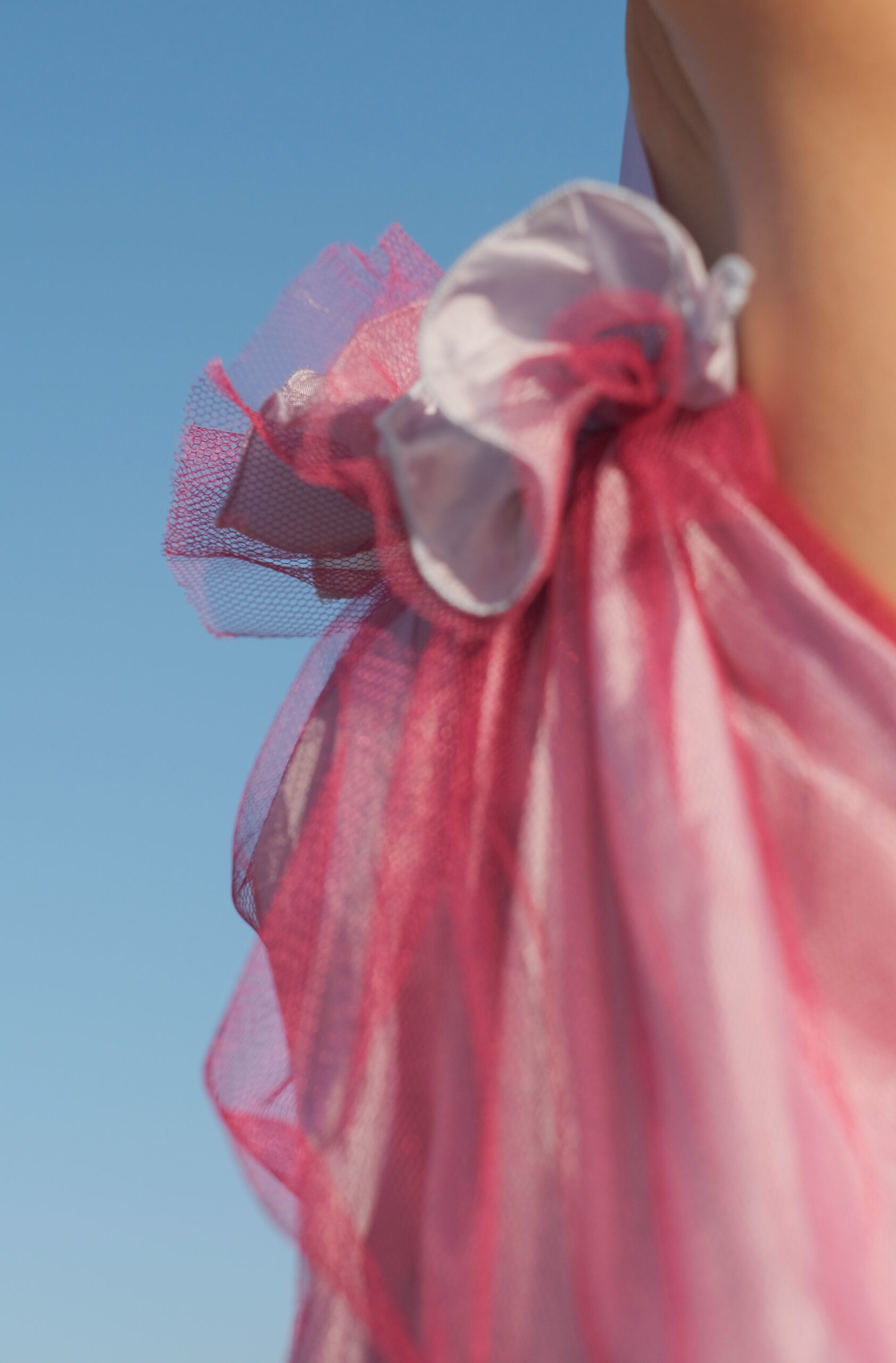 Le top tulle est composé de deux rectangles de tissu, une doublure pongé lilas, joint à du tulle, rose framboise, par des fronces qui créent du volume et de jolis reliefs, le tout maintenu par des rubans de satin lilas.
